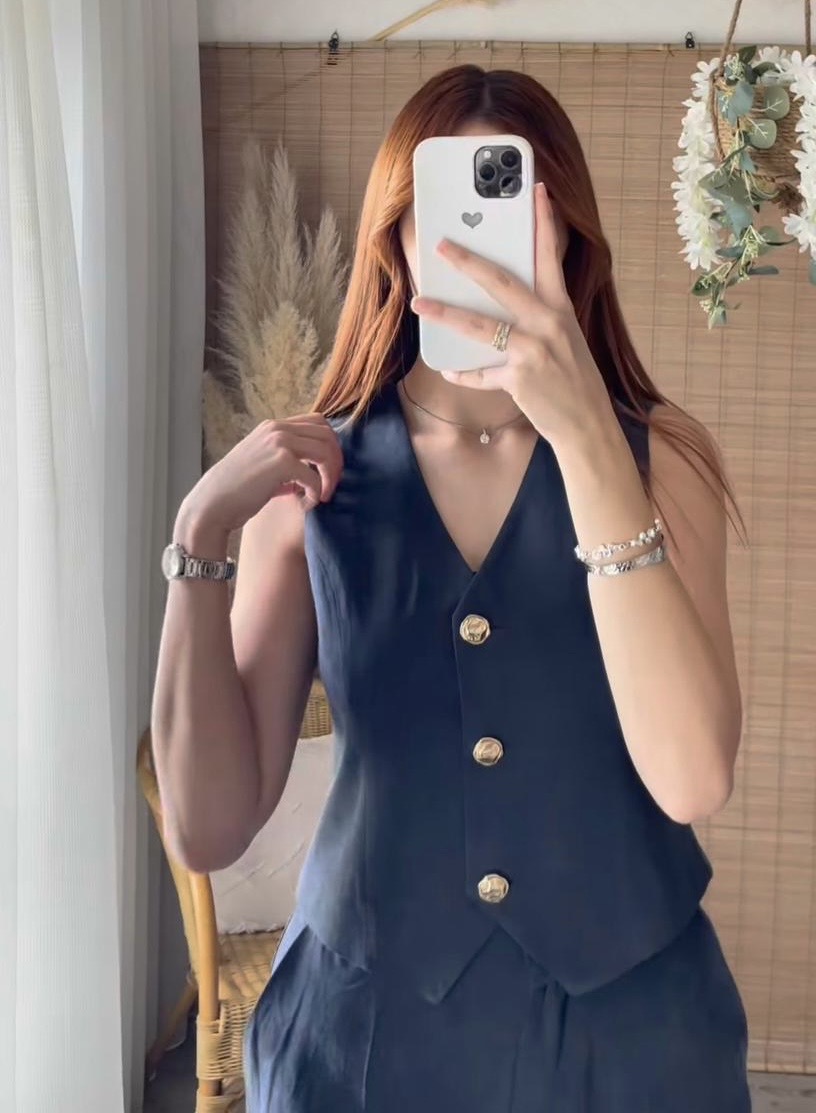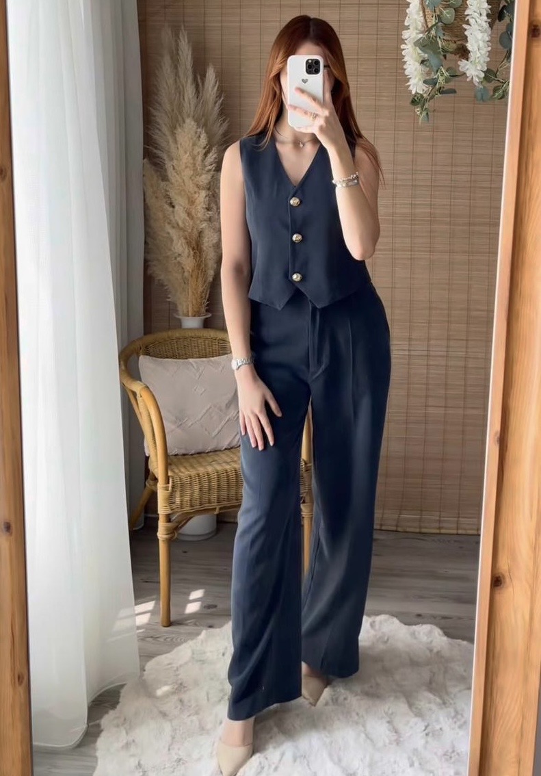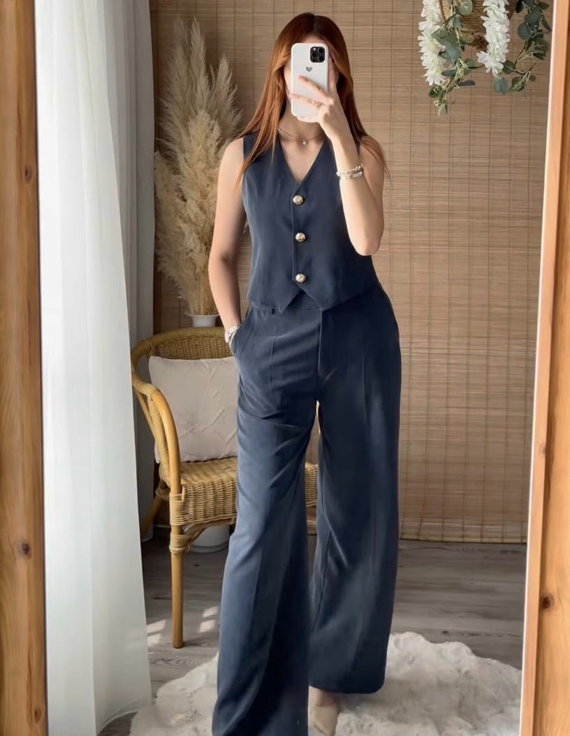 Ensemble bleu chic à boutons dorés – Élégant et raffiné, cet ensemble se compose d’un pantalon fluide et d’un gilet sans manches orné de boutons dorés. Sa coupe moderne et sa teinte profonde offrent un style classe et sophistiqué, idéal pour toutes les occasions. Disponible en plusieurs tailles.