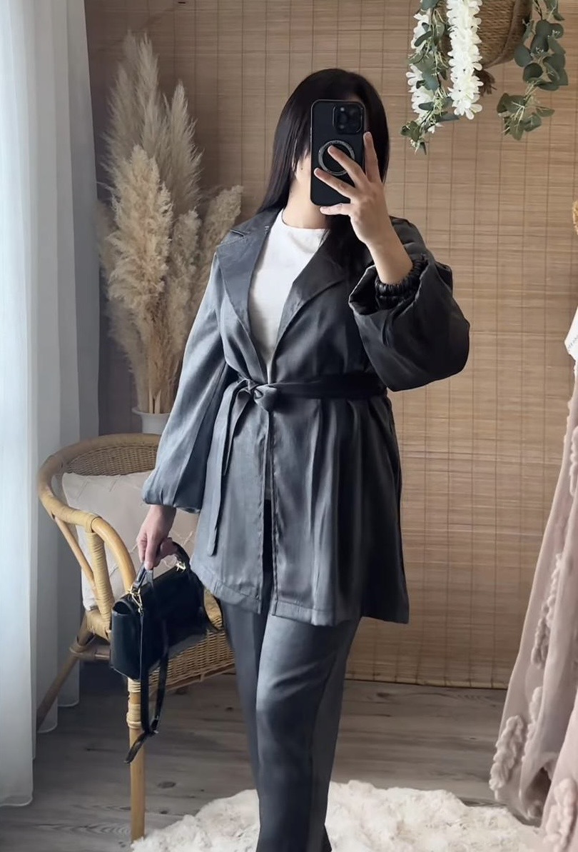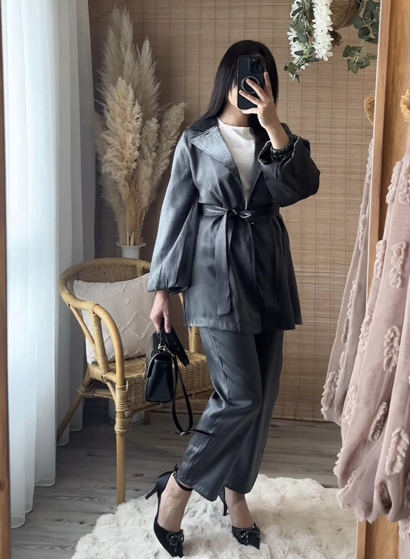 Découvrez notre ensemble gris foncé en matière satinée, à la fois ample, confortable et tendance. Sa texture douce et fluide apporte une touche chic à votre look tout en offrant un confort optimal au quotidien. Disponible du S au L, cet ensemble est idéal pour un style décontracté et raffiné.