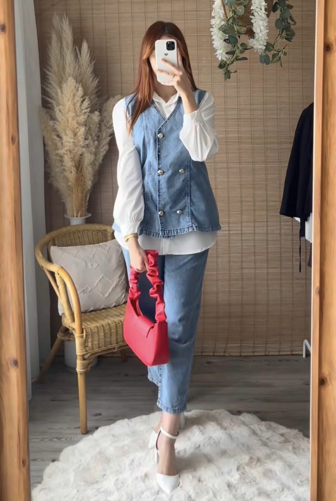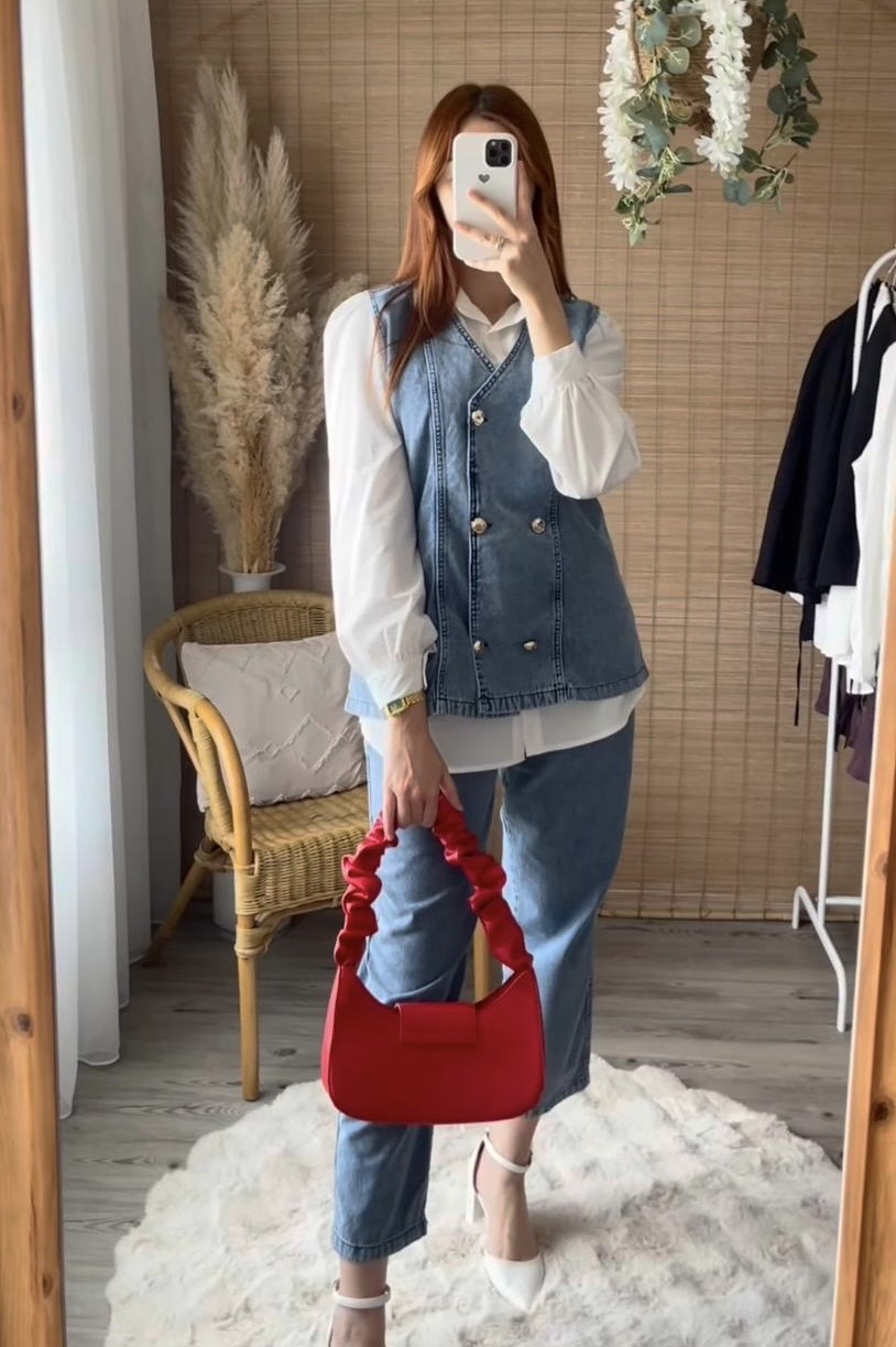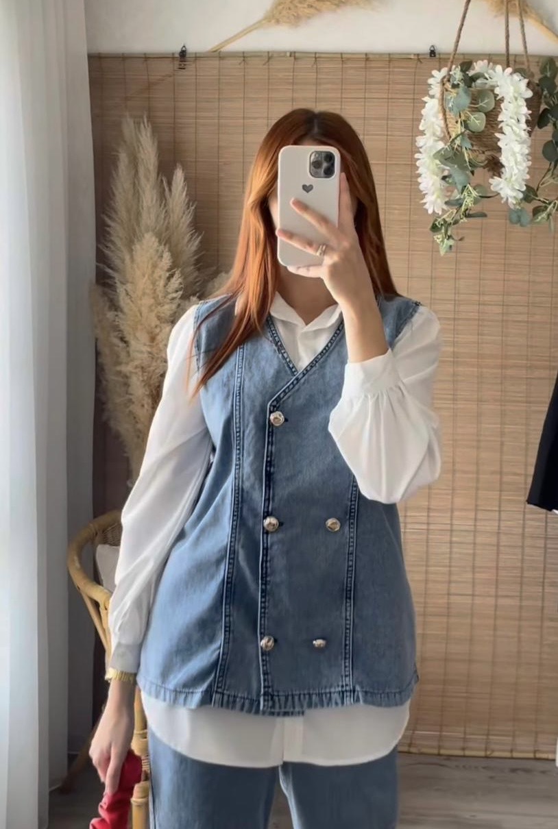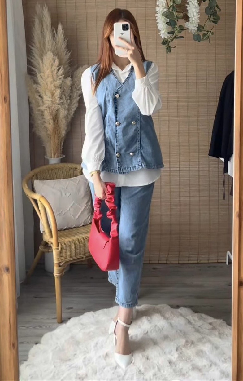Ensemble effet jean femme avec pantalon large et haut sans manches. Tendance, confortable et moderne, parfait pour un look casual chic.