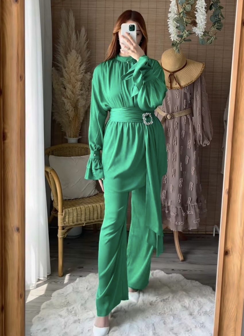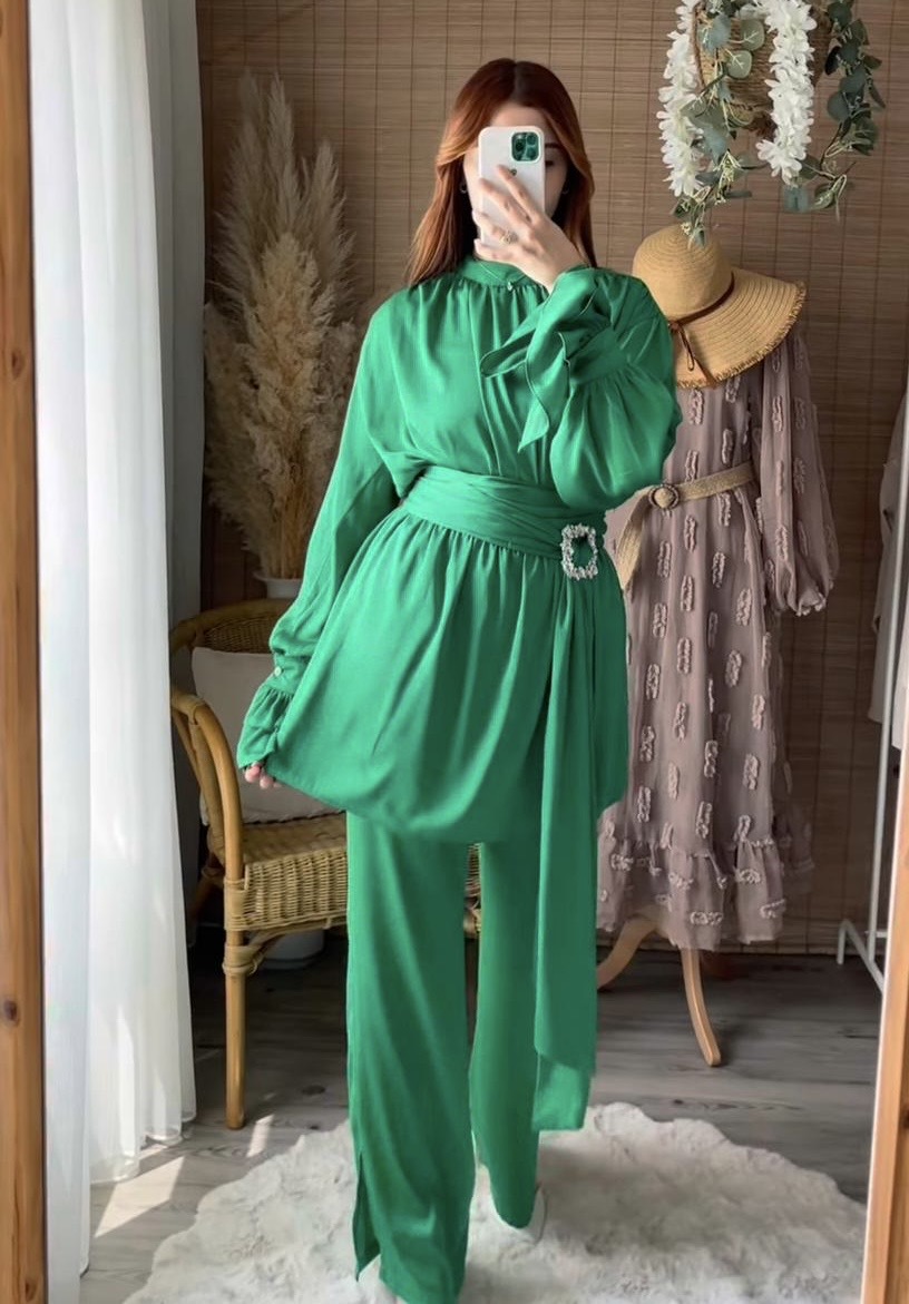 Ensemble vert satiné avec ceinture – Tendance et raffiné, cet ensemble en matière satinée se distingue par sa jolie ceinture qui souligne la taille avec élégance. Confortable, fluide et lumineux, il apporte une touche chic à toutes vos occasions.