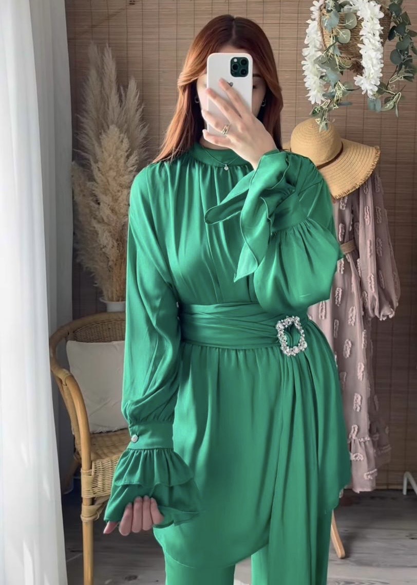 Ensemble vert satiné femme avec jolie ceinture. Fluide, élégant et tendance, idéal pour un look chic.