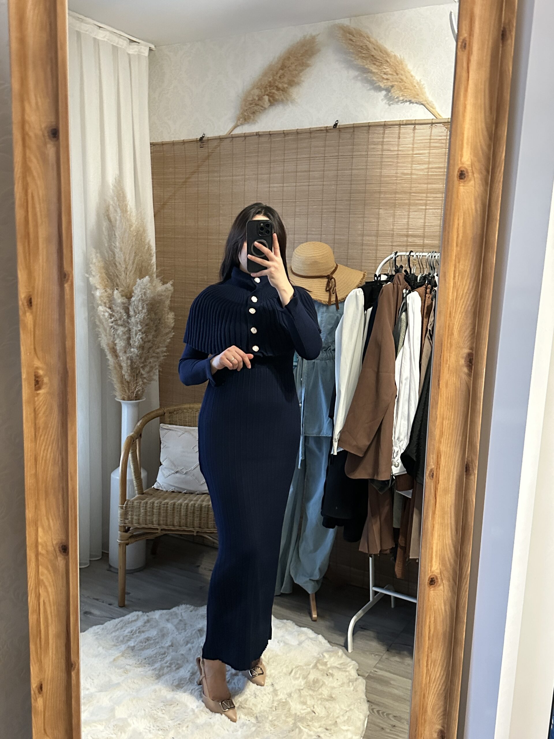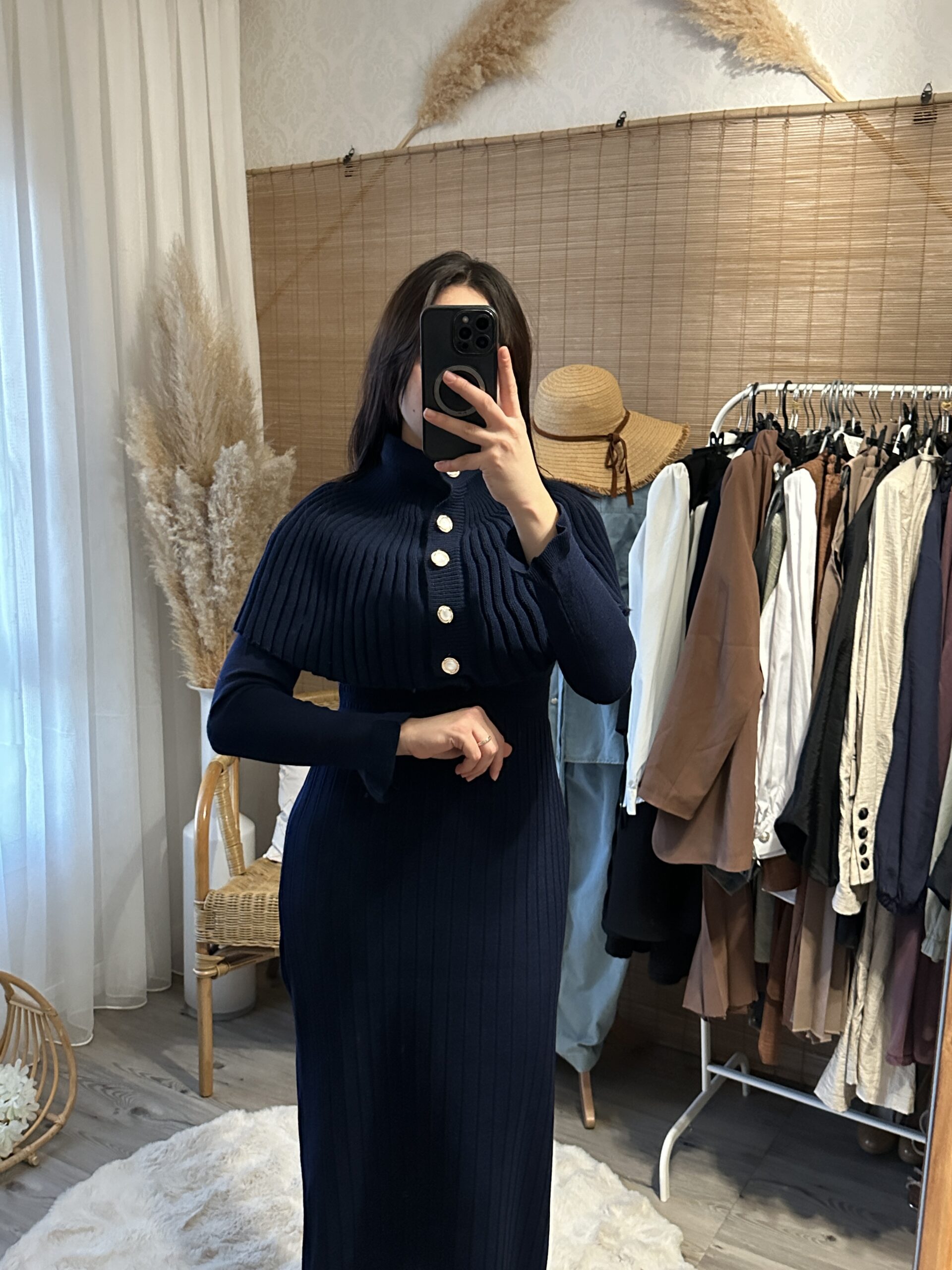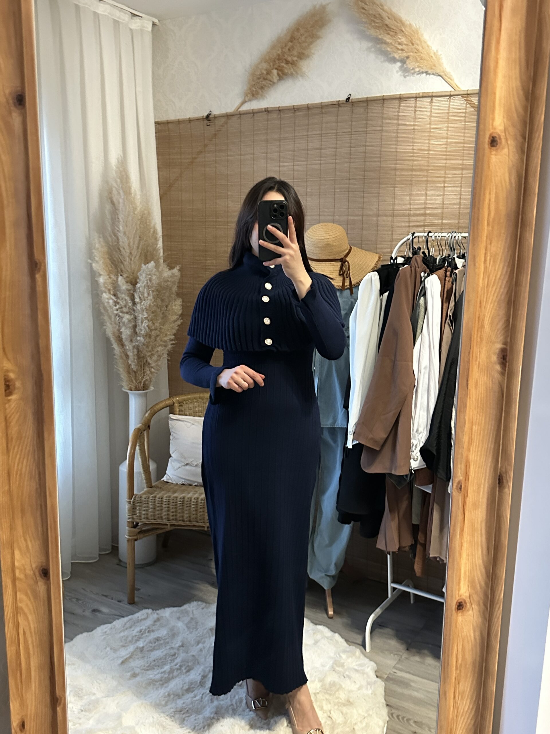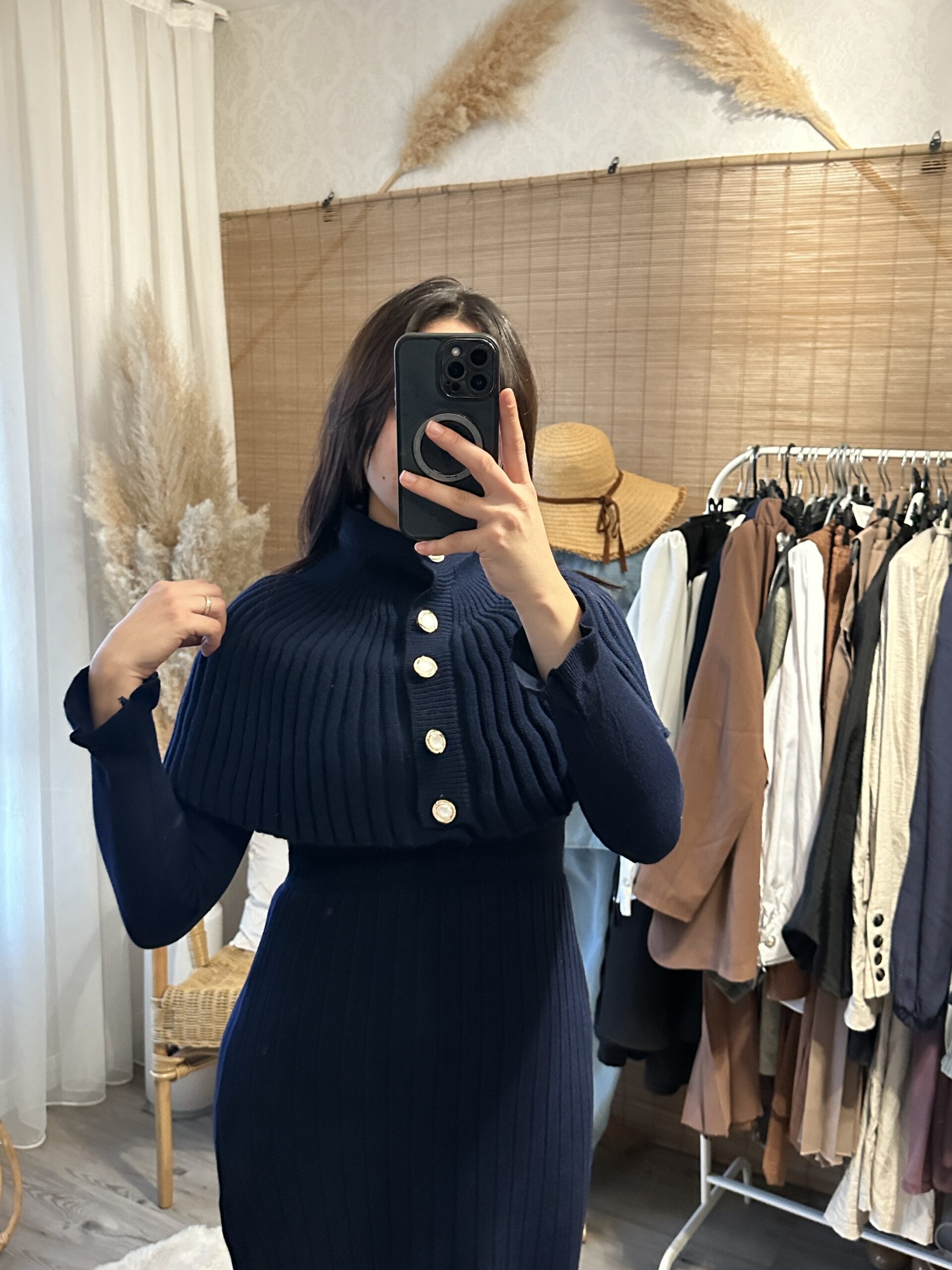 La robe en maille bordeaux à boutons dorés présente une coupe ajustée conçue pour mettre en valeur différentes morphologies. Sa matière en maille extensible offre un confort exceptionnel tout en soulignant harmonieusement les courbes naturelles. La longueur de la robe est idéale, alliant élégance et juste dose de pudeur.