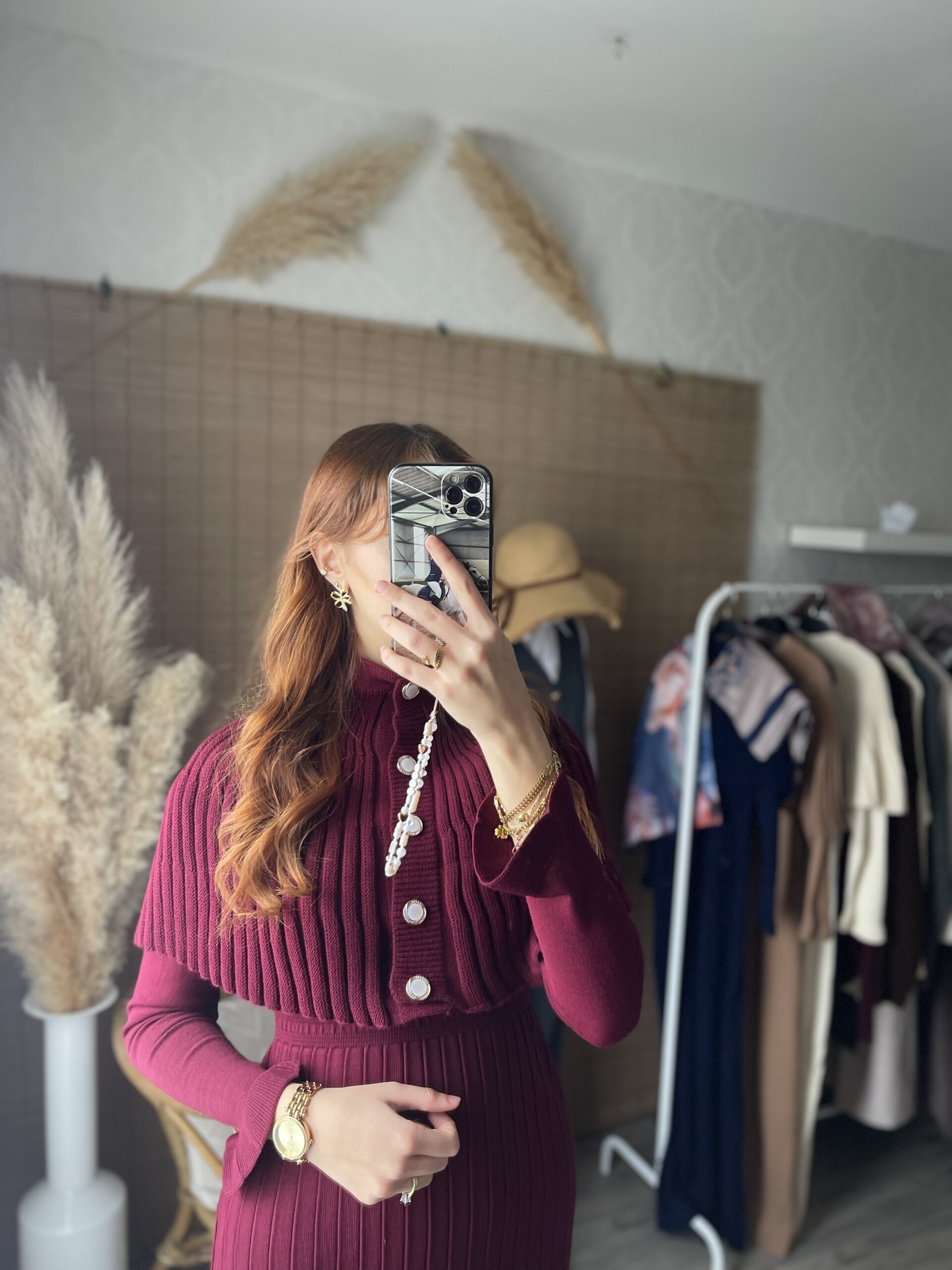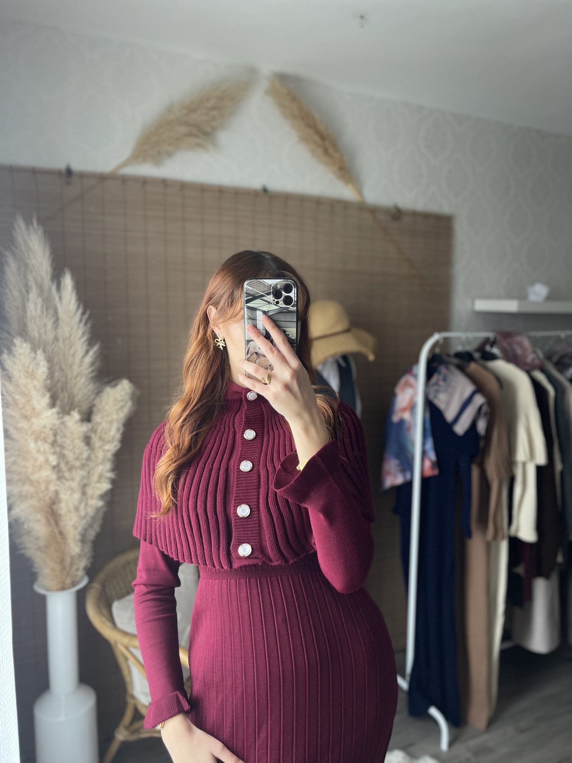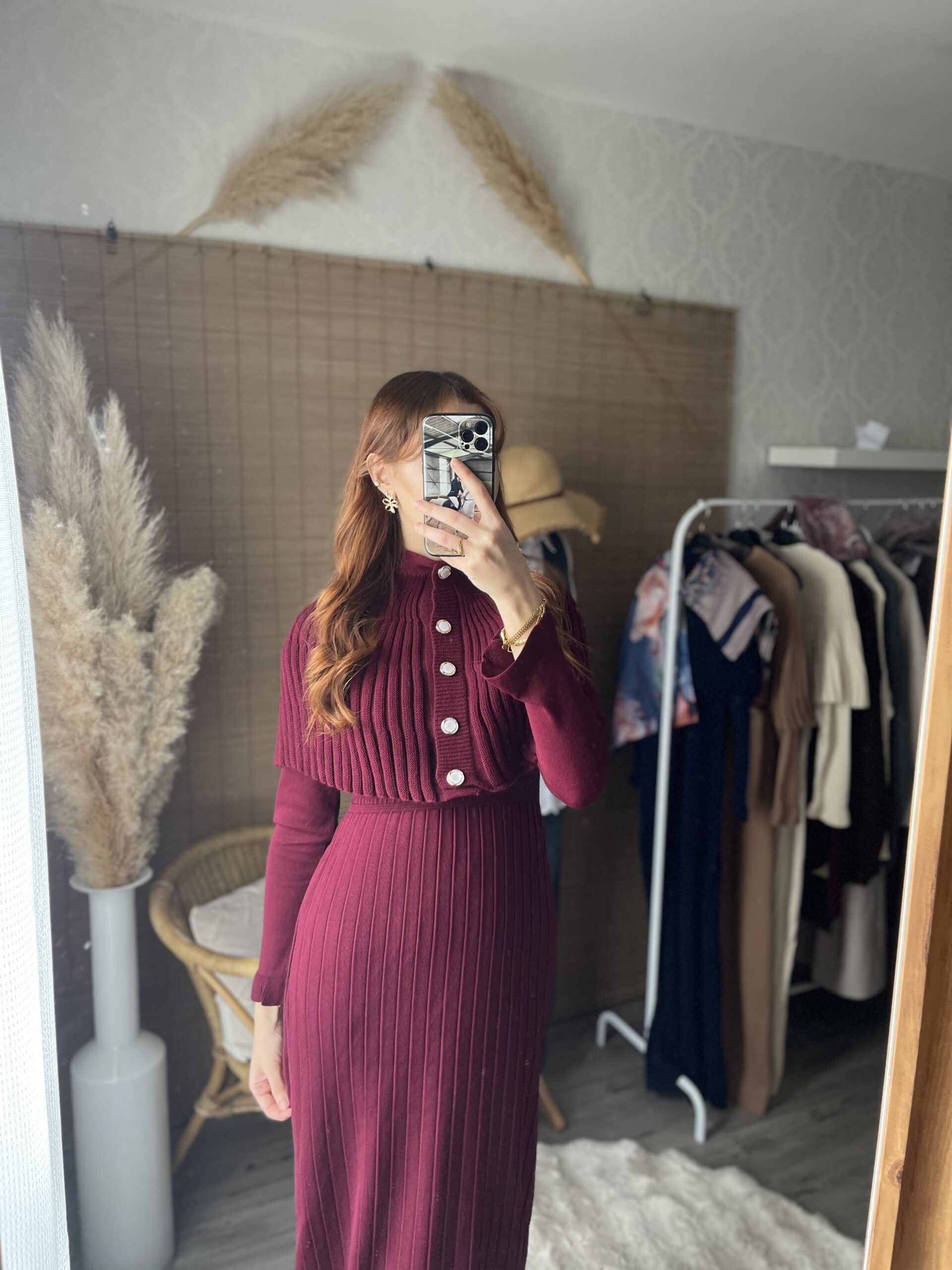 La robe en maille bordeaux à boutons dorés présente une coupe ajustée conçue pour mettre en valeur différentes morphologies. Sa matière en maille extensible offre un confort exceptionnel tout en soulignant harmonieusement les courbes naturelles. La longueur de la robe est idéale, alliant élégance et juste dose de pudeur.